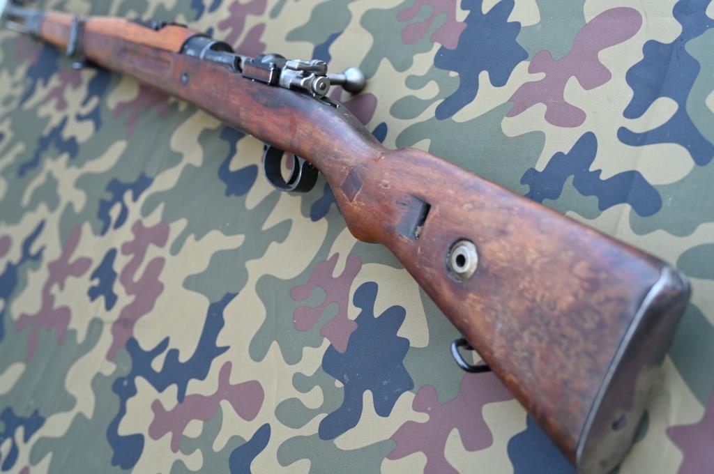 Optisch und technisch rundum ordentlicher, homogener, „normaler“ altersgemäßer Gesamteindruck, Brünierung ca. 97 % mattschwarzgrau erhalten. Gut erhaltener Nussbaumholzschaft mit allesamt normalen, völlig harmlosen Gebrauchsspuren. Handschutz aus Schichtholz, tiptop. Am Pistolengriff wurde einmal eine Trageringöse entfernt und das entstandene Loch beidseitig sauber mit einem rechteckigen Holzstück arsenalmäßig verschlossen. Kolbenplatte etwas geputzt wirkend, an einer Ecke mit leichten Närbchen vom langen Stehen auf feuchtem Boden.