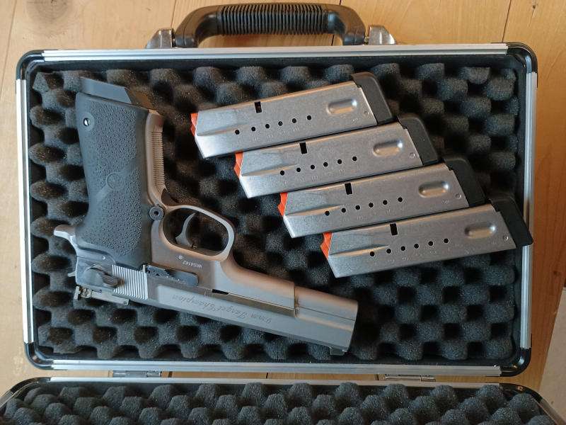 Mit dabei sind gleich 4 Magazine und der original Metallkoffer mit S&W PC Logo mit funktionierenden Zahlenschlössern.