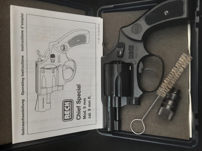 Schreckschuss Revolver Reck International Mod. 9mm Chief Special Cal. 9mm R.K. in gebrauchtem Zustand, fast wie neu. Alte PTB 503. Trockenfunktion ist gegeben. Becher, Bürste, Anleitung und Koffer sind dabei.