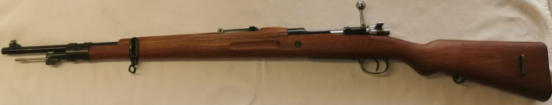 Spanischer Nachbau des deutschen Karabiner K98 (Hersteller: Santa Barbara) im Kaliber .308 Winchester. Der Lauf ist spiegelblank, Schloss und Abzug einwandfrei. Kaliber .308 Winchester; Zustand: Sehr gut / neuwertig; Lauflänge ca. 60cm; Gesamtlänge ca. 112cm; Verschluss sauber, ohne Spiel; Abzug: Druckpunkt; Sicherung: funktionsfähig; Einzellader; Visierung: Offene Visierung mit Kimme und Korn; Schäftung: sehr guter Zustand; Oberflächen: keine groben Beschädigungen; Schaut euch die Waffe an, Bilder vorhanden. Falls weitere Bilder gewünscht, bitte genau beschreiben, wir tun was wir können.