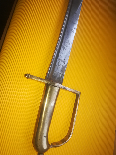 Verkaufe Grenadiersäbel, Original, wohl Kleinstaat 18.Jh., Messinggefäß mit alter Lötstelle, Klinge graviert "Sonne,Mond, magische Zeichen", Keilklinge mit zwei schmalen Zügen (s.Fotos), GL 85cm, KL 72,5 cm, Verkauf nur an Pers. über 18 J. Altersnachweis,