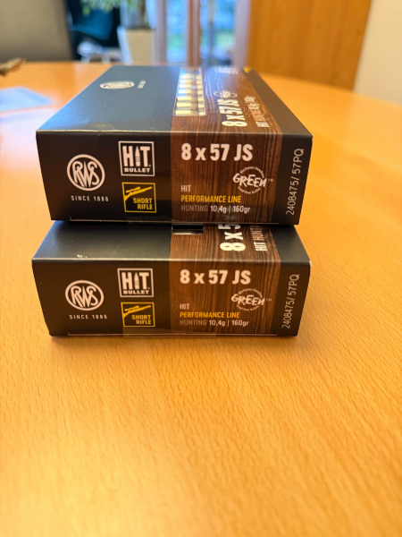 Verkaufe an Berechtigen 2 ungeöffnete Packungen (40 Patronen) Munition 8 x 57 IS von RWS, HIT Short Rifle. Die beiden Schachteln tragen die gleiche Los- bzw. Fertigungsnummer - siehe Foto.