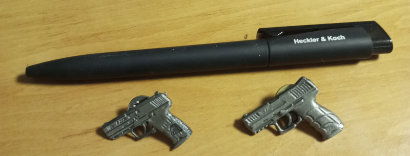 Verkaufe 2 verschiedene Anstecknadeln von Heckler und Koch in Pistolenform und einen original HK-Kugelschreiber