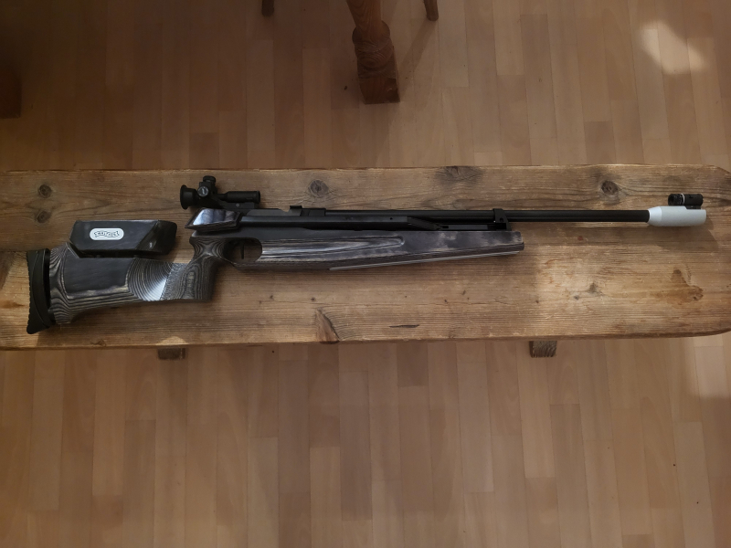 Walther Lgm2, sehr guter gebrauchter Zustand. Luftgewehr wurde seit längerer Zeit nicht mehr geschossen, da ich auf Pressluft umgestellt habe. Teures verstellbares Ringkorn und Koffer mit dabei.