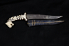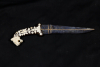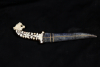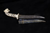 Dolch, Indien, 20. Jh., Griff aus Masse, verziert mit eingelegten Bein, Abschluss plastisch aus Bein geschnitzter Tigerkopf, Stoffscheide, sehr dekorativ. L: 37 cm.