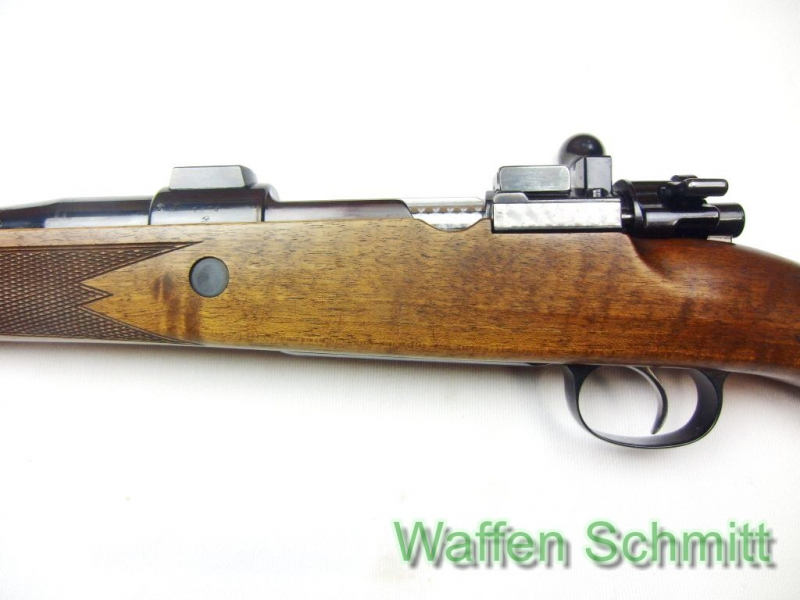 Lauf von innen ohne Mängel, 98er System mit Flügelsicherung, 4-Schuß Magazin von oben zu laden, Direktabzug, Metallteile hochglanz brüniert, Nußbaumholzschaft mit deutscher Backe und 2cm Gummischaftkappe, Riemenbügel, Schaftlänge 36cm, Gesamtlänge 118cm. Sehr gepflegter Zustand!!!