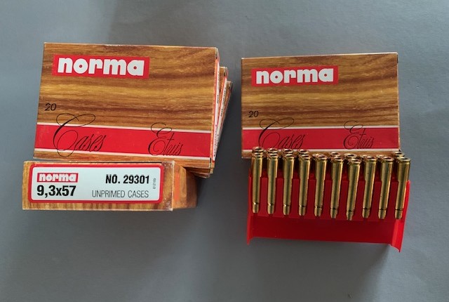 Sie bieten auf 100 fabrikneue Hülsen der Firma Norma Kaliber 9,3x57. Die Hülsen sind aus dem gleichen Fertigungslos.