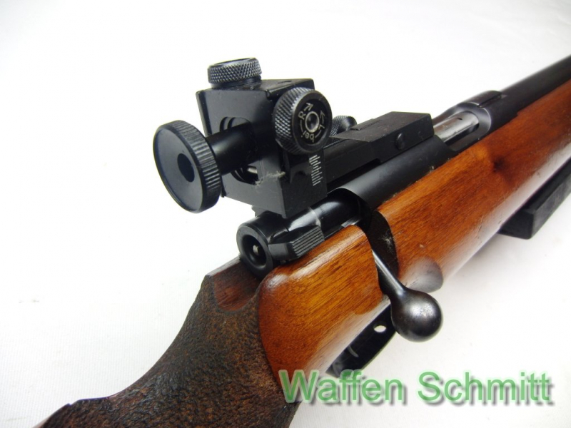 Sie bieten auf eine Einzellader-Matchbüchse Walther im Kaliber .22lr. 22mm Matchlauf mit einer Länge von 65cm (Lauf von innen ohne Mängel), original Walther Diopter-Visierung, Flügelsicherung, fein einstellbarer Matchabzug, lackierter Nußbaumholz-Matchschaft mit Backe und schwarzer Gummischaftkappe für Rechtsschützen, abnehmbarer Auflagekeil unter dem Vorderschaft. Schaftlänge 36cm, Gesamtlänge 113cm. Guter Zustand!!!
