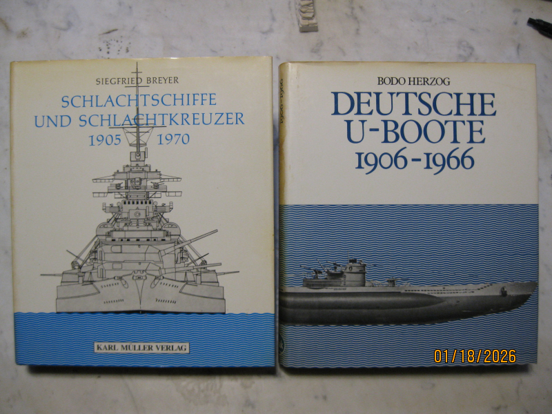 Deutsche U-Boote von 1906 bis 1966 von Bodo Herzog. 25x22cm, 323 Seiten. Schlachtschiffe und Schlachtkreuzer von 1905 bis 1970 von Siegfried Breyer. 26x22cm, 505 Seiten. Gebrauchtware, keine Garantie, kein Umtausch.