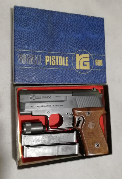 Angeboten wird eine originale Röhm RG 600 Signal-/Schreckschusspistole im starken Kaliber .22lang (Platz) aus der West-Germany-Produktion (1980er Jahre)———- Die Waffe befindet sich in sehr gutem, gepflegtem Zustand und wurde nur wenig benutzt, und danach immer sorgfältig gereinigt.Funktioniert tadellos mit geringen Gebrauchsspuren Fotos ———- Lieferumfang (vollständig) – Röhm RG 600 – Originalverpackung – Original-Bedienungsanleitung – Signalabschussbecher – 2 Magazine sehr schönes, komplettes Set für Sammler und Liebhaber klassischer Röhm-Modelle.———- Abgabe nur an Personen ab 18 Jahren. Privatverkauf, keine Garantie oder Rücknahme.
