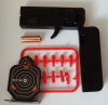 Lieferung mit 12 Plastikgeschossen, 1 Hülse und 1 Zielscheibe.