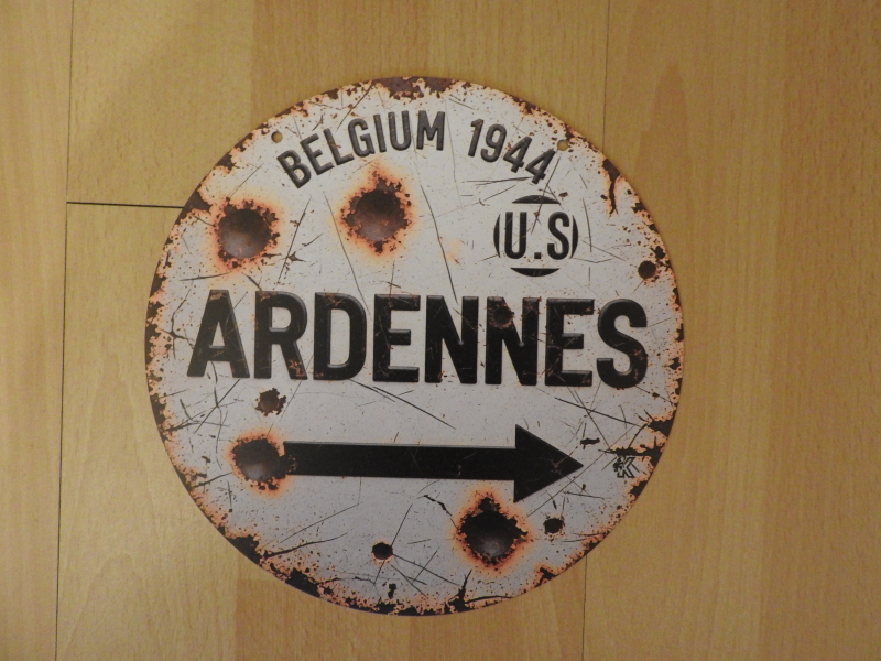 Biete Blecherinnerungsschild an die Ardennenschlacht. Schild zeigt einen Wegweiser der US-Truppen. Das Schild ist rund und hat einen Durchmesser von 20 cm. Alter und Herkunft sind mir nicht bekannt. Gefertigt offensichtlich im Siebdruckverfahren.