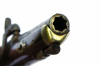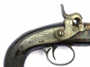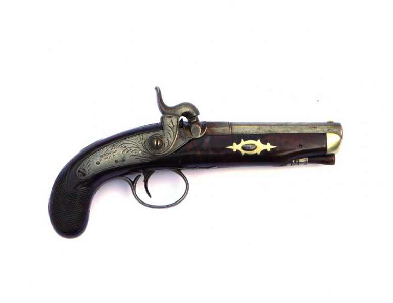 Zweifach gemarkt, gibt diese Taschenpistole ihren berühmten Hersteller an: Es handelt sich um Henry Deringer in Philadelphia. Seine hochwertigen kleinen Pistolen wurden zum Namensgeber für eine ganze Gattung von Taschenpistolen. Wegen ihrer eleganten und aufwendigen Bauweise waren die kleinen Pistolen äußerst beliebt und wurden vielfach nachempfunden. Auch dieses Exemplar weist die typischen Merkmale eines echten Deringers auf: Schaft aus poliertem Nussbaum mit Fischhaut, Beschläge aus Neusilber, rückliegendes Perkussionsschloss mit Springkeil, tief gezogener Lauf. Mit einer Länge von 20 cm gehört die Waffe zu den größeren Exemplaren Deringers. Beim Kaliber blieb man mit 9 mm eher im unteren Bereich, was das Schießen sicher leichter beherrschbar machte. Alles in allem eine gefällige kleine Waffe mit einem berühmten Namen!