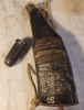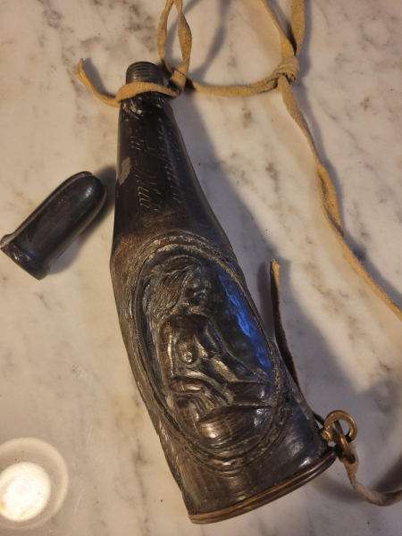 Erotische alte Pulverflasche aus schwarzem Horn, wahrscheinlich amerikan. Pronghorn, 19 cm lang, eine Seite mit nackter Frau in ovalem Kranz, daneben in Schnörkelschrift in Französisch 2 Zeilen eingraviert, ich kann nur "Biguille" entziffern (=franz. Nadel). Andere Seite tief erhaben HB evtl. für Hudsons Bay? geschnitzt. Der Verschluß ist in Penisform und zugleich Pulvermaß zum Einfüllen, ist zum Abschrauben.