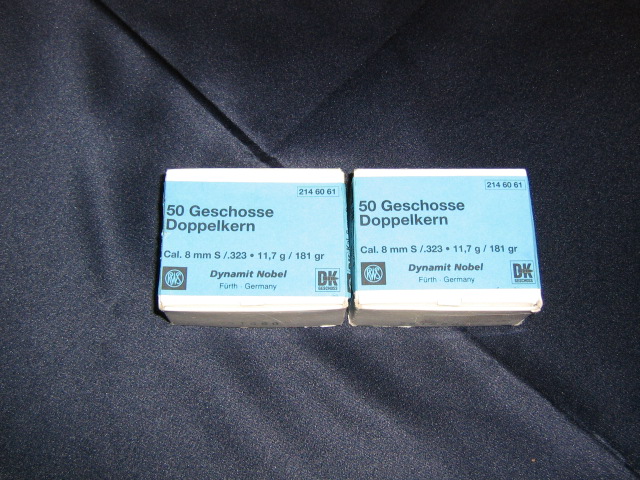 Zum Verkauf stehen hier 2 ungeöffnete Schachteln (je 50 Stk.) RWS Doppelkerngeschosse im Kaliber 8mm S /.323 mit einem Geschossgewicht von 11,7 Gramm. Verkauf wegen Umstellung auf bleifrei / Überbestand. Privater Verkauf ohne Rücknahme, Garantie und Wandlung!