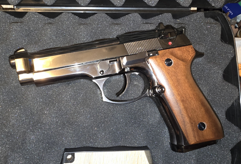 Hallo, biete hier eine KLI M92 fusion, 6mmBB, Gas an, in schwarz chrom. Die waffe hat Blowback, hat keine gebrauchspuren, waffe ist aus Metall. Mit dabei ein Waffenkoffer. Was aussieht wie Flecken auf der waffe sind nur Öl Spuren von der Pflege. Waffe hat echtholzgriffschalen