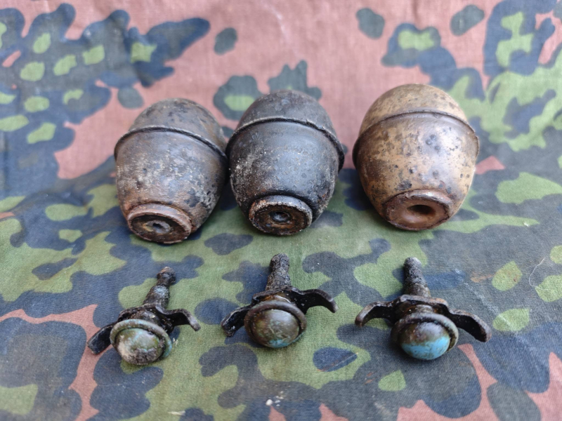 Originale deutsche M39 Eierhandgranaten aus dem Zweiten Weltkrieg, reine Relikte.