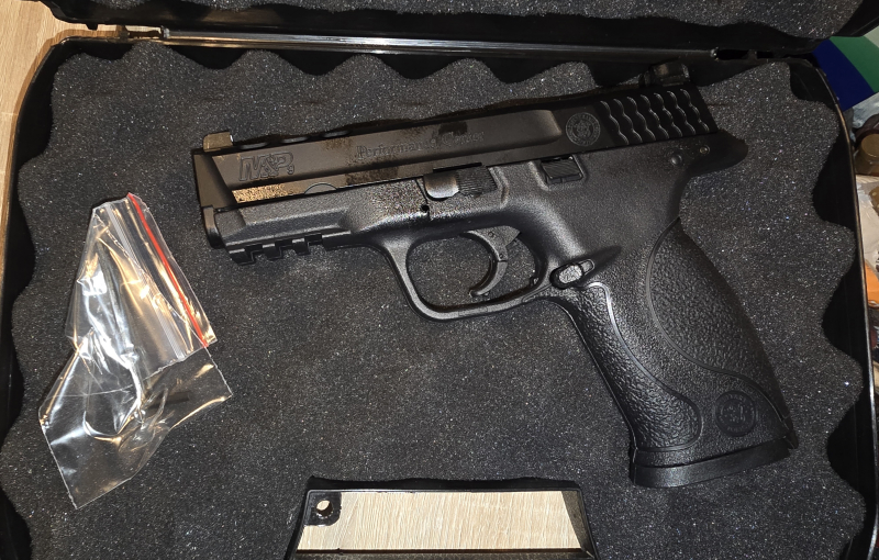 Hallo, biete hier eine Smith&Wesson 9 Performance Center, 6mmBB, Gas an, in schwarz. Die waffe hat Blowback, hat keine gebrauchspuren, waffe ist aus Metall mit polymer body. Mit dabei ein Waffenkoffer. Was aussieht wie Flecken auf der waffe sind nur Öl Spuren von der Pflege.