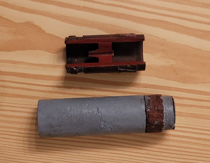 Zwei Fragmente deutscher Gewehrgranaten aus dem 2. Weltkrieg. Eins davon als Schnittmodell ausgeführt. Frei von Gefahrenstoffen, rein als Deko bzw. Belegstück.