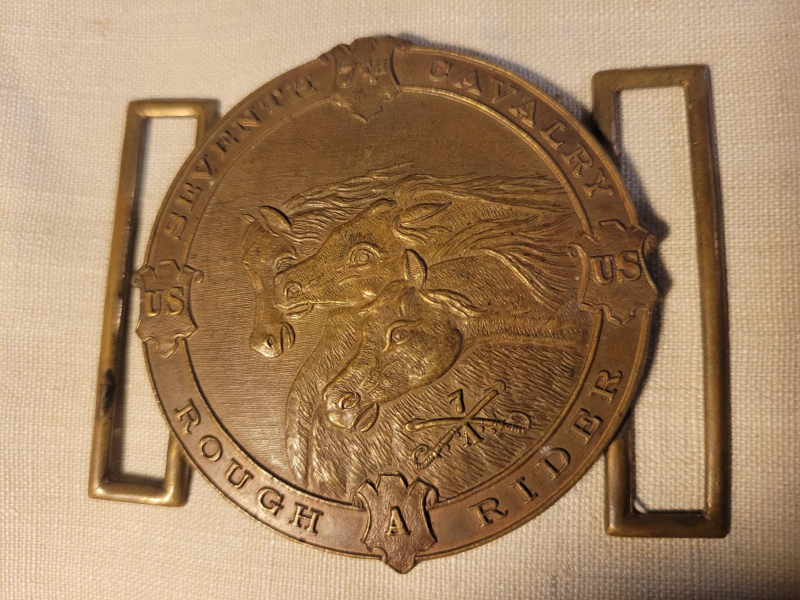 Zweiteilige 7. Cavalry Offiziersgürtelschließe aus der nach-Custer Zeit bis 1910 bzw. Span.Am.War, für Mills-Webbing-Offizierskoppel. Hergestellt ab ca. 1880 bei Purdy, London. Garantiert original und 1a erhalten. In USA sehr begehrt und ca. $ 250! Repliken davon gibts genug..... Ich verkaufe noch div. andere Schließen, komplette Koppel, Revolver + Patronentaschen von Civil War bis ca. 1930, mehrere Uniformen bis 1910. War 25 Jahre im Indianermuseum Bretten und Derenburg öffentlich ausgestellt.