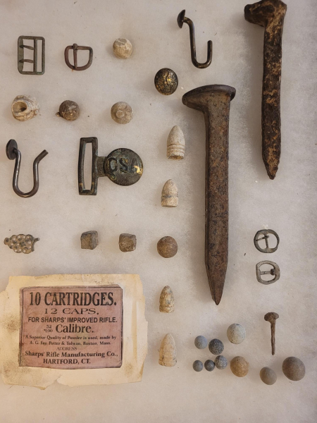 div. Geschosse von Cal. .28 bis .58 inkl. Sharps, 1 Schienennagel von Harpers Ferry (+dazu zum Vergleich einen alten deutschen Schienennagel), Koppelhaken, 1 US Knopf, Gamaschenschnallen usw. insges. 29 garantierte Original Relics. Die meisten von Fredericksbourg. Das Label Sharps Patronen ist dekorative Fotokopie.