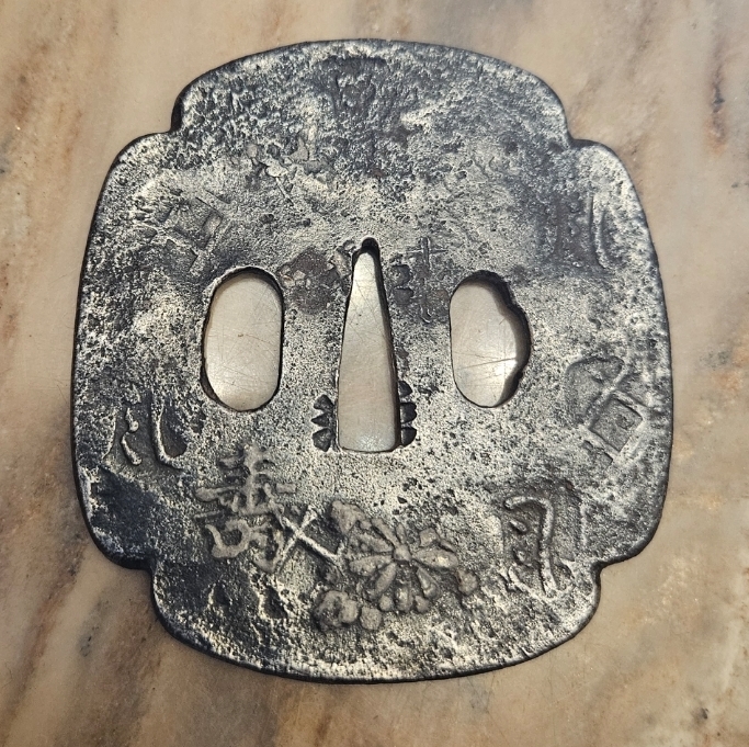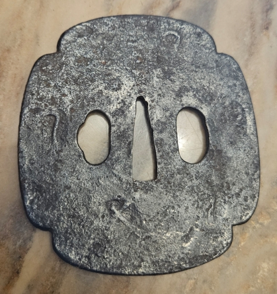 Liebe Egunner, zum Verkauf kommt hier eine besonders große Tsuba, ein besonders frühes Exemplar, Schmiedeeisern mit dezenter Verzierung und in typischer Kleeblattform. 85mm länge und 78mm Breit machen sie zu einem recht stattlichem Exemplar! Ich hatt sie aus einer Sammlung rausgekauft in der sie aus über 80 Stück die Größte war (ich musste wohl was kompensieren... ^^). Sie passt sehr gut zu dem Übungsschwert aus meiner anderenAukrion, zu dem ich sie Montieren wollte, aber dazu kam ich nie. Wie bei jeden Privatverkauf gilt auch hier: keine Rücknahme, keine Garantie. VIEL SPAß BEIM BIETEN! :D