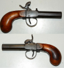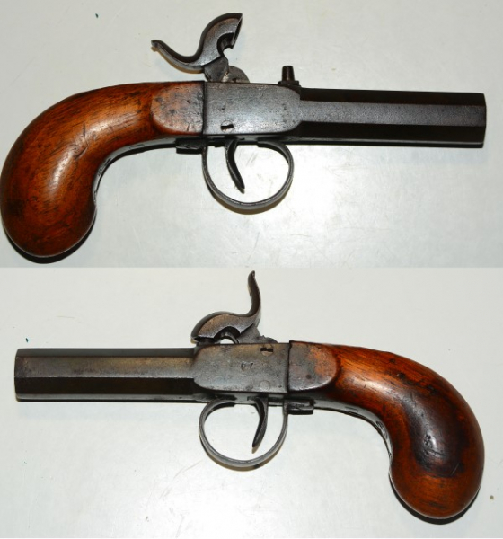 Original Perkussions-Pistole, Terzerol, Lauflänge 62 mm, Gesamtlänge 16,5 cm, Kaliber 11,7 mm, Metall altersbedingt braune Patina aber kein Rost, technisch in Ordnung
