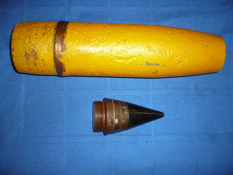 Britische Granate in guter Erhaltung. Kaliber ca. 82,83m mit geschraubtem Boden , Teil enthält keine verbotenen Stoffe.