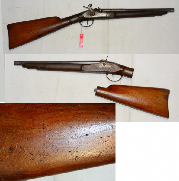 Original Perkussionsgewehr, 2. Hälfte des 19. Jahrhunderts, Wilderergewehr mit abnehmbarem Kolben, Lauflänge 32, 5 cm, Gesamtlänge mit Kolben 71,7 cm, ohne Kolben 43,8 cm, Kaliber 12,8 mm, im Schaft alte Holzwurmlöcher, die Feder schwach aber noch ok, Metall rostfleckig, der Ladestock fehlt