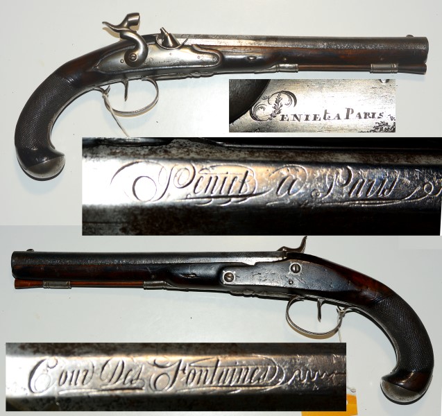 Original Perkussions-Pistole, Büchsenmacher Peniet aus Paris, Peniet war Büchsenmacher zwischen 1773 und 1810, es handelt sich um eine ehemalige Steinschlosswaffe, die ca. 1840/50 auf Perkussion aptiert wurde, Lauflänge 24,3 cm, Gesamtlänge 38,5 cm, Kaliber 13mm. es handelt sich wohl um eine Duellpistole, worauf die Visierung hinweist, rechts gegenüber dem Schloss ein kleiner Ausbruch am Laufbett mit folgendem Riss, insgesamt jedoch guter Zustand mit Alterspatina