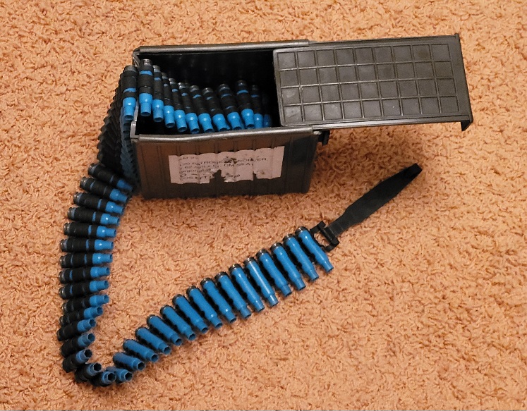 Hülsen der blauen Trainingsmunition der Bundeswehr (PT = Plastik Training), Kaliber .308 Winchester bzw. 7,62x51mm NATO, auf voll bestücktem Maschinengewehrgurt/ Zerfallgurt Modell M13/DM60 in Gurtkasten Modell DM40004. Siehe Bilder.
