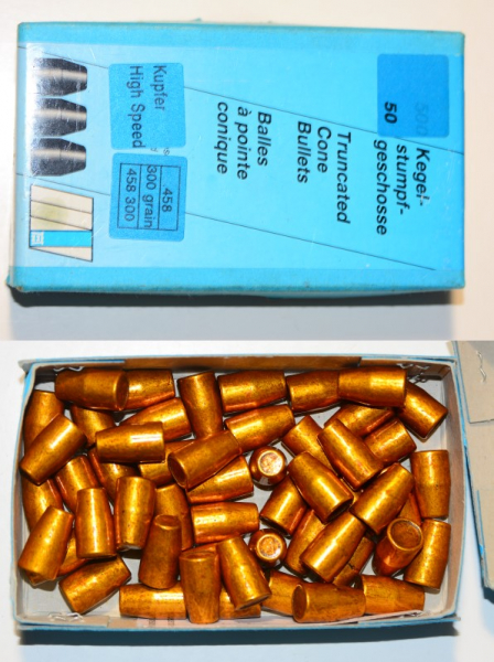 Verkupferte Geschosse von Haendler & Natermann, für .45 Kaliber, Geschosskalibe .458, 300 Grains Geschossgewicht, angebrochene Packung mit noch 53 Geschossen