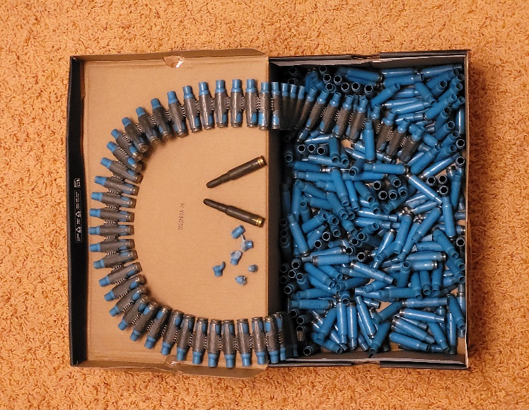 Eine Kiste voller Hülsen der blauen Trainingsmunition der Bundeswehr (PT = Plastik Training), Kaliber .308 Winchester bzw. 7,62x51mm NATO. Teilweise auf Maschinengewehrgurt Modell DM1. Dabei sind auch ein paar blaue Geschosse und Hülsen von Platzpatronen. Siehe Bilder.