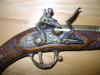 Reproduktion einer alten Steinschlosspistole. Der Griff ist mit Schnitzereien verziert. Ebenso sind reichlich verzierte Messingbeschläge verbaut Die Pistole ist beschossen Batterie funkt. Italienische Fertigung im Cal. 50,