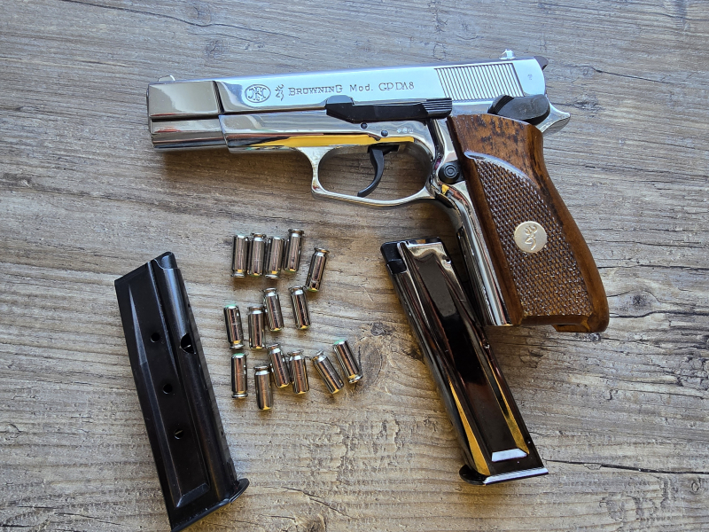 Pistole Browning GPDA8 mit Holz Griffschalen, zwei Stahlmagazine, 15 Stück 8mm Schreckschusspatronen. Kaliber 8mm PAK, PTB 389 in leicht gebrauchtem Zustand.