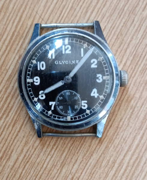 Diese Uhr hier wurde vom Schweizer Hersteller Clycine gefertigt, die Herseller-Nummer ist D 87696 H. Ziffernblatt ist noch sehr gut lesbar. Die Cromschicht auf dem Messinggehäuse weisst allerdings alters und Gebrauchsgenäss schon einige Kratzer auf. Das Uhrwerk läuft an sobald man die Uhr aufzieht, sollte aber durchaus von einen Uhrmacher kontrolliert werden, da die Uhr nach einiger Zeit anfängt mindestens 15 min vorzulaufen. Ich habe die Uhr vor ein paar Jahren normal getragenm bis das Repro-Lederarmband kaputt ging. Seit dem liegt sie in einer Kiste m it und wird hinundwieder aufgezogen. Die Lederarmbänder bekommt man heute noch als Repro oder als Lederarmband für die Bundeswehrdienstuhr, die eine Kopie mit Batteriebetrieb dieser alten Uhren ist.