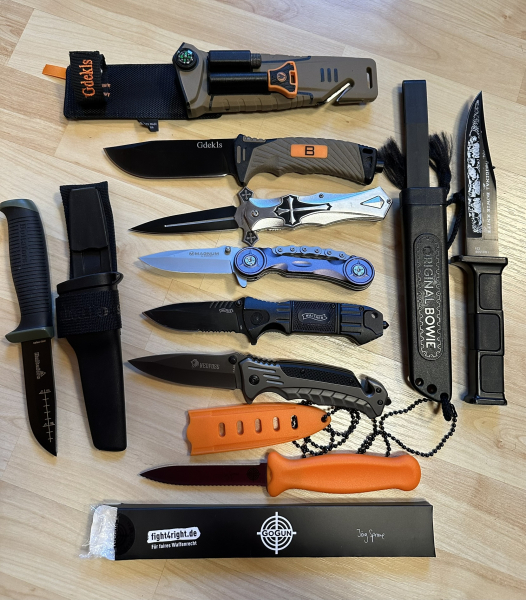Die Teile sind zum Teil neu oder mit leichten Gebr. Spuren. Brötchendolch von Jörg Sprave und Midgards Messer Neu, Böker Messer neu, Nedfoss Flipper, Hultafos Outdoor Neu Survival Messer Neu, Bowie Messer Original aus Germany leicht gebraucht...