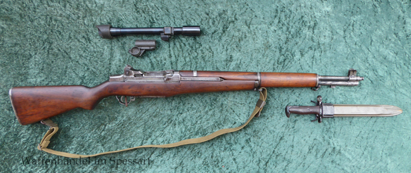 Hersteller Springfield Armory (1942). Kal..30-06 Springfield. Ser.Nr. 506627. Unberührtes unverfälschtes Stück von dem Kämpfen am 2.April 1945 in Waldensberg (Vogelsberg). Das Laufinnere hat gute Felder und Züge ist aber klassisch rauh. Orig. abgegriffere Phospatierung. Inspektorenabnahme links im Holz neben dem System. Mit passendem orig. Bajonett von 1942 und daran gewesenem Web Gurt.