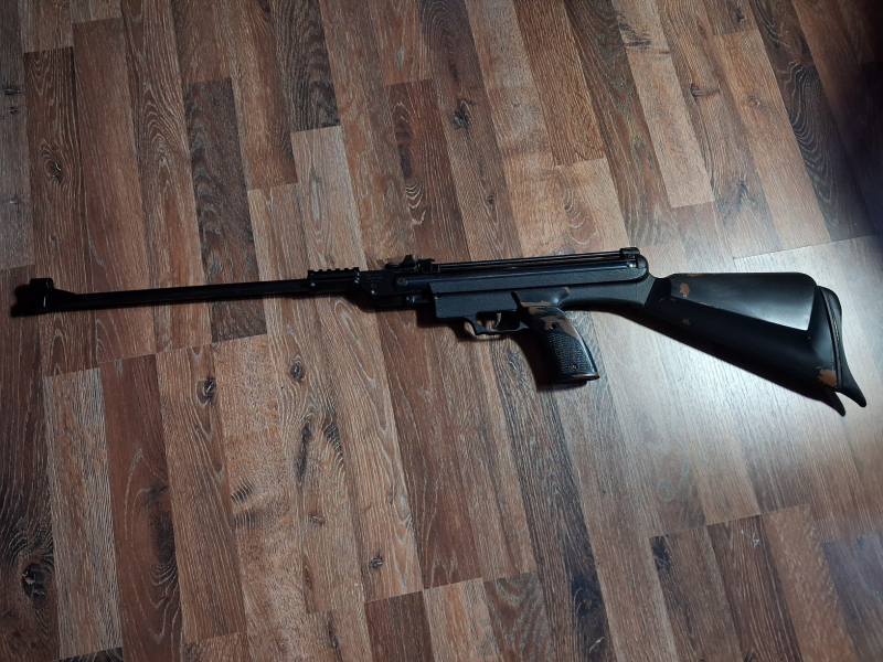 Die Waffe ist hat Gebrauchsspuren und Flugrost (siehe Foto) Der Schaft und Griff sind aus Kunststoff und wurden mal schwarz lackiert, wobei der Lack allerdings auf dem Kunststoff nicht gehalten hat und abblättert. Der Verkauf erfolgt unter Ausschluss jeglicher Gewährleistung/Sachmängelhaftung. Keine Rücknahme.