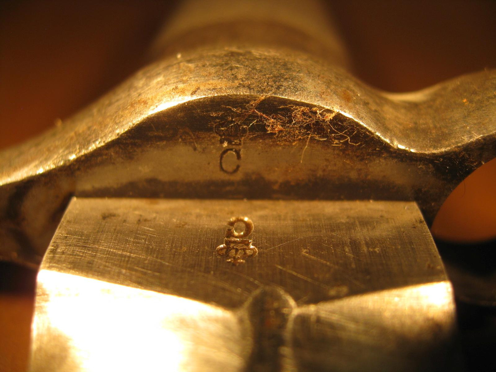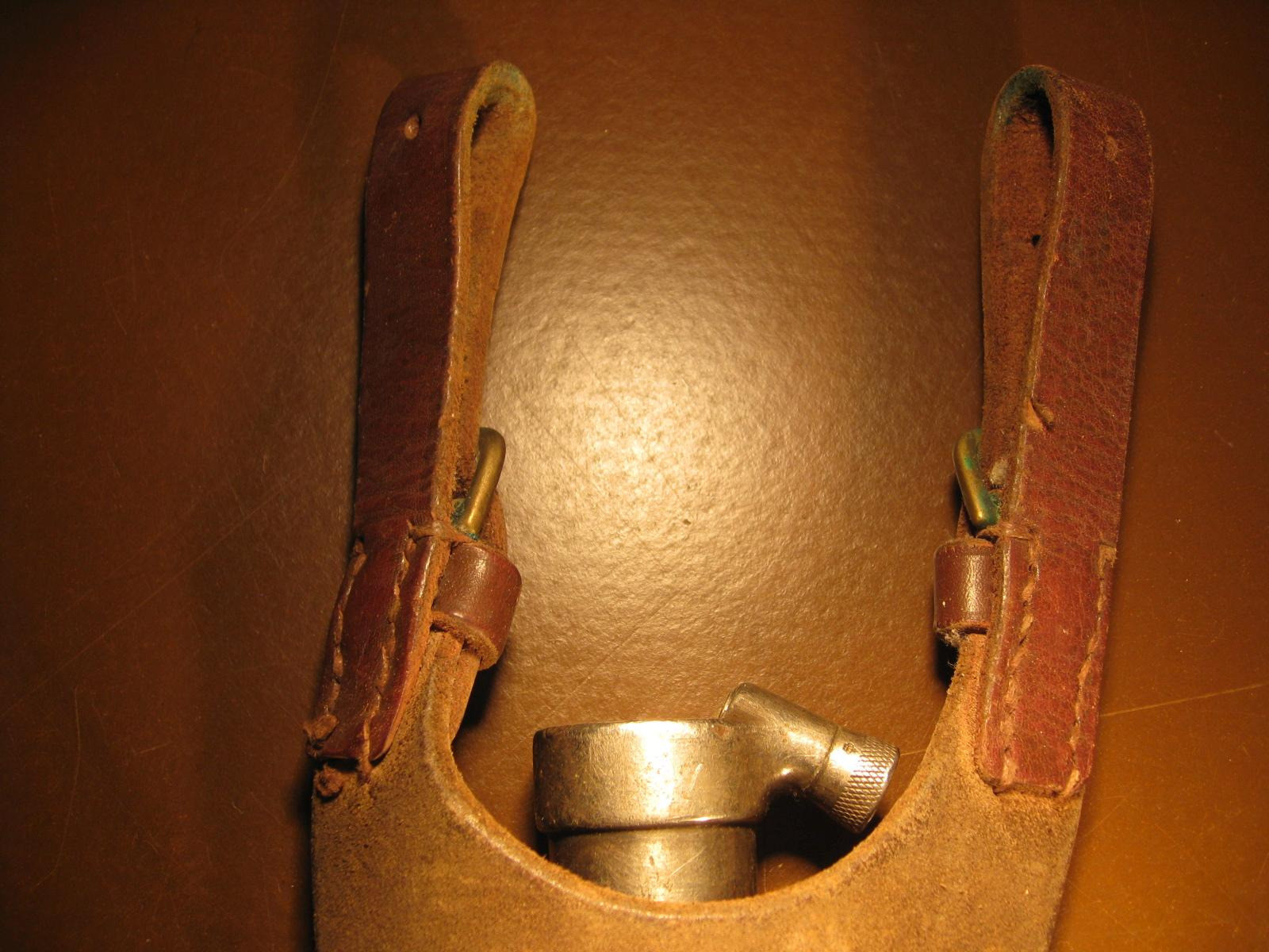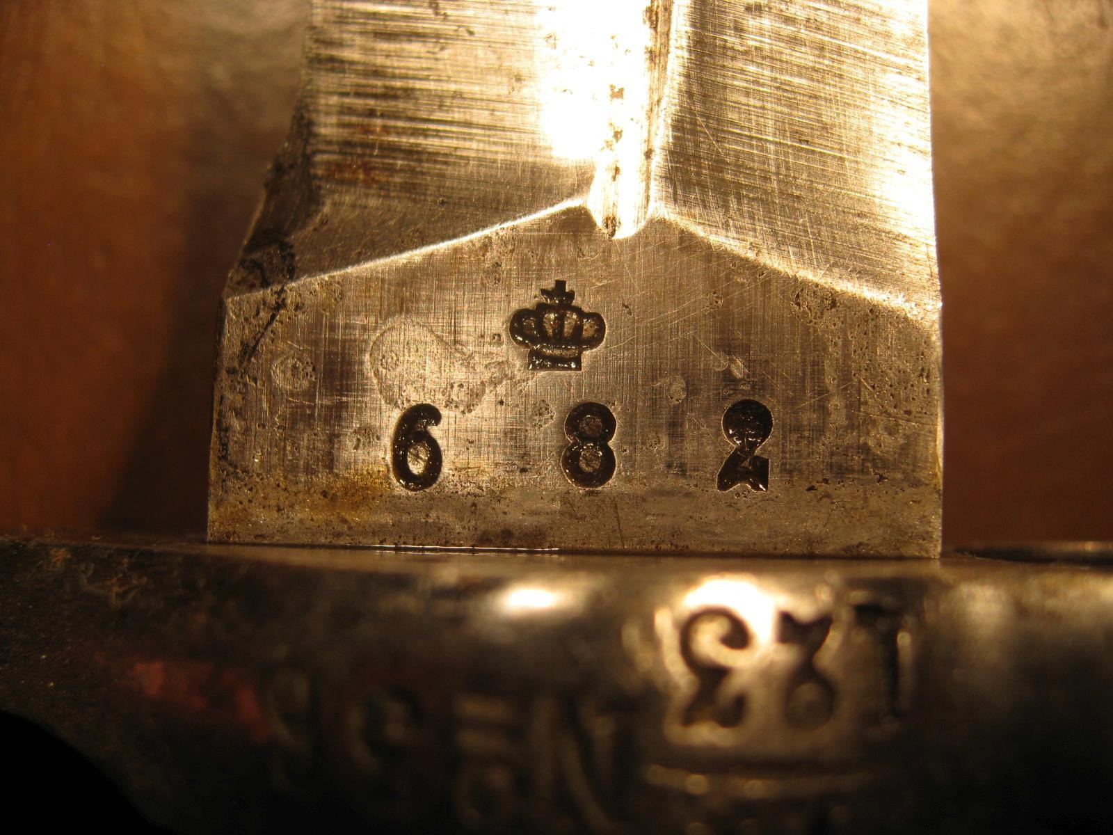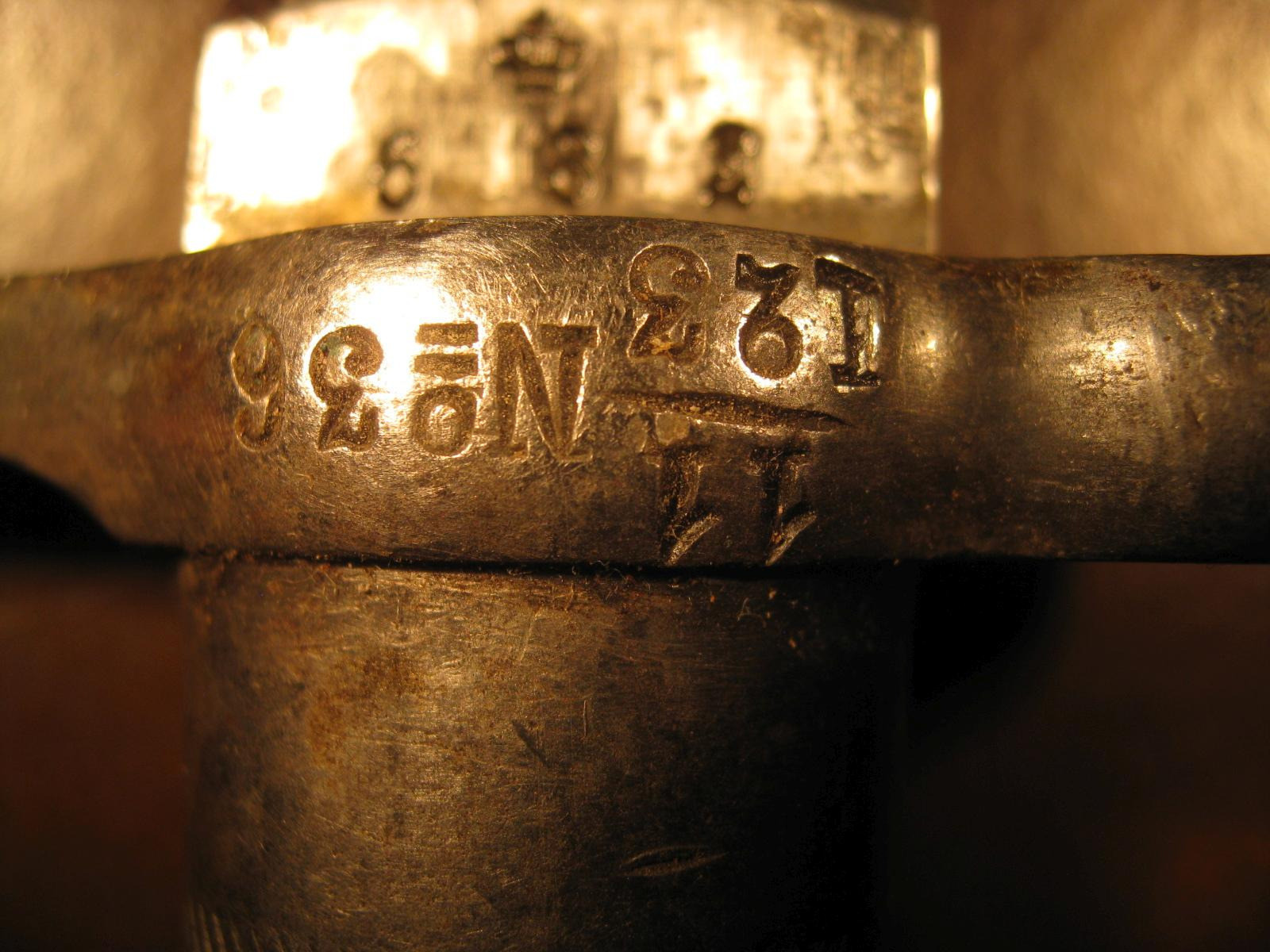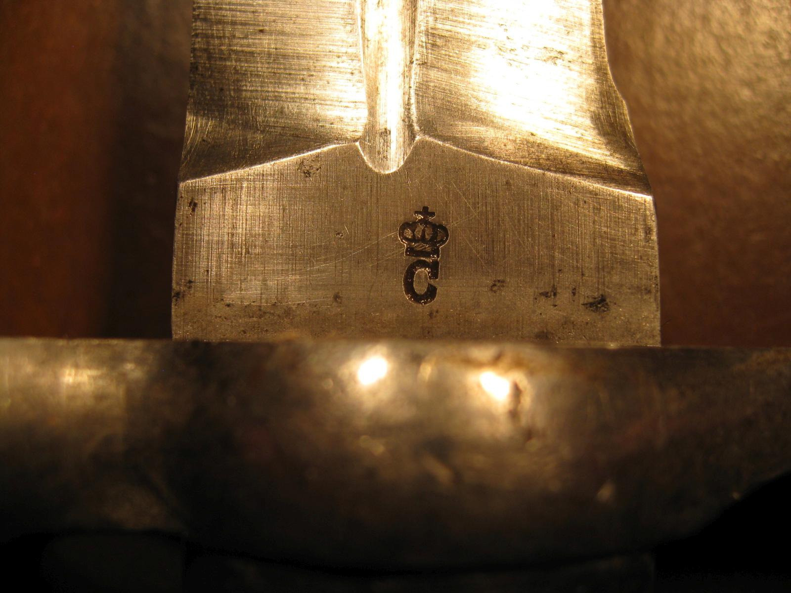 Koppelschuh bzw. SG-Tasche mit drei Kronen als Prägestempel (Tre Kronor); Abnahmestempel.