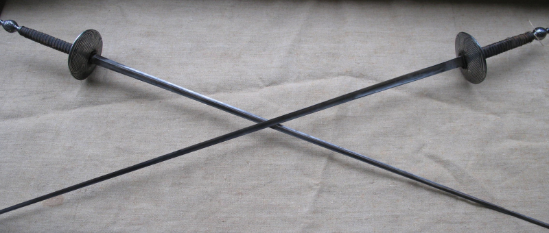 ein Paar Duelldegen 19. Jahrh. Eisenmontierung mit Fassetendekor (Innen- und Ausenseite der Stichblätter) sowie der Pommel. Typische 3-Kantklinge (bekannt als Lungenfuchser, wurden in Deutschland offizell für das Duell verboten, da ein Stich in die Lunge tödlich ist) Als Päarchen nicht oft zu bekommen. Klingenlänge ca. 87,5 cm. Gesamtlänge ca. 106,5 cm (beide Stücke identisch). Klingen Signiert, Klingenthal. Eine der Klingen mit kleinen Kantenausbruch, Scharte im unteren drittel siehe Foto.