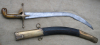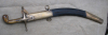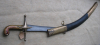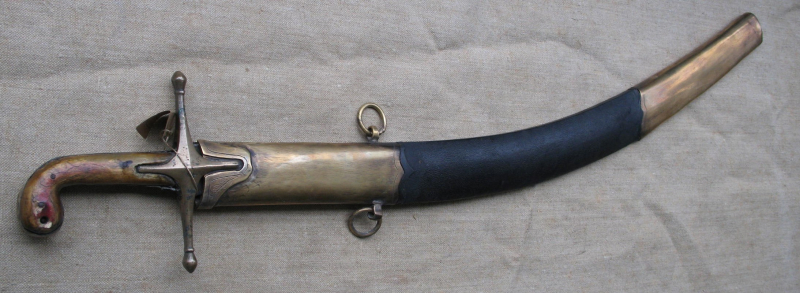 osmanischer Kilij mit der typisch stark gebogenen T- Rückenklinge und Jelman Spitze. Messingmontiertes Handstück mit Horngiff. Scheide mit Messingbeschlägen, lederbezogener Holzkorpus mit der ebenfalls typischen Metalfadennaht auf der Rückseite. Scheide ist im oberen Bereich rückseitig geschlitzt um das einführen der stark gebogenen Klinge zu ermöglichen. Klingenlänge über die Pfeilhöhe ca. 64 cm. Gesamtlänge ohne Scheide über die Pfeilhöhe ca.78 cm. Klingenbreite oben ca. 39 mm.