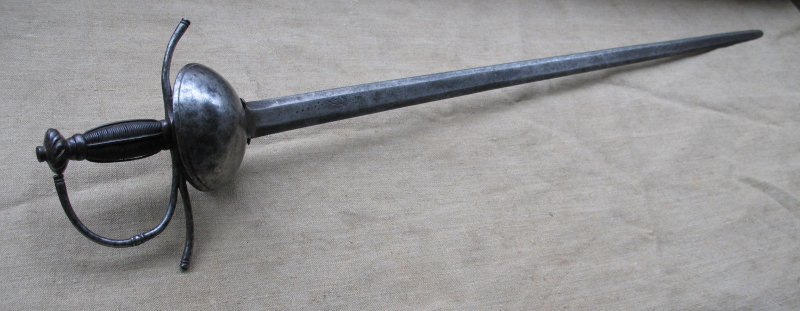 ein kräftiges Schalenrapier, Reiterwaffe. Eisengefäß mit Nierenschalen, Parierbügel und Spangen sowie gezwirbeltem Knauf . Breite beidseitig geschliffene Klinge, diese vorderseitig mit kleiner Wolsmarke und Sternen. Klingenlänge ca. 89 cm. Gesamtlänge ca. 107 cm, Klingenbreite oben ca. 33 mm.