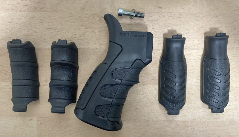 UPG Griff für Waffen mit einem AR15 Griffsystem. Der Griff kann mit den Griffschalen auf die gewünschte Größe angepasst werden. Die passende Fixierschraube gibt es dazu.