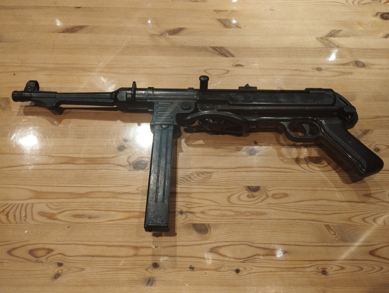 Ich biete hier eine MP40 als Modellwaffe aus Metall an, Abzug und Verschluss funktionsfähig, das Magazin lässt sich entnehmen.