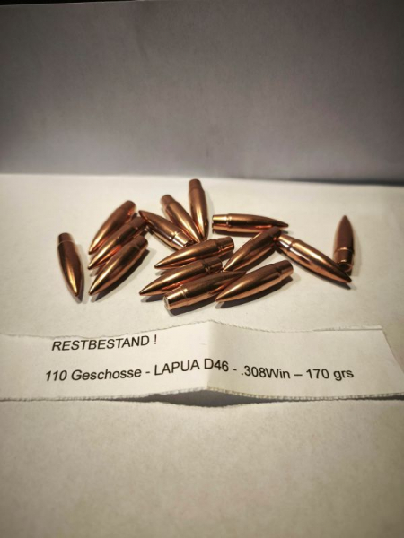 110 Stück Lapua Geschosse, .308 Win, 170grain, Vollmantel Boat Tail, D46,