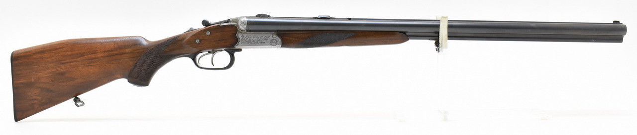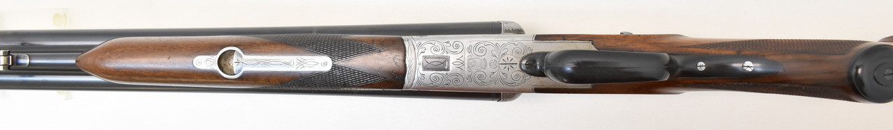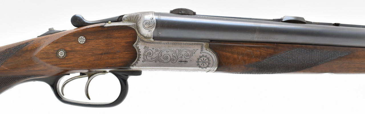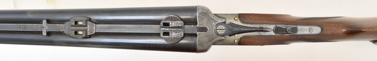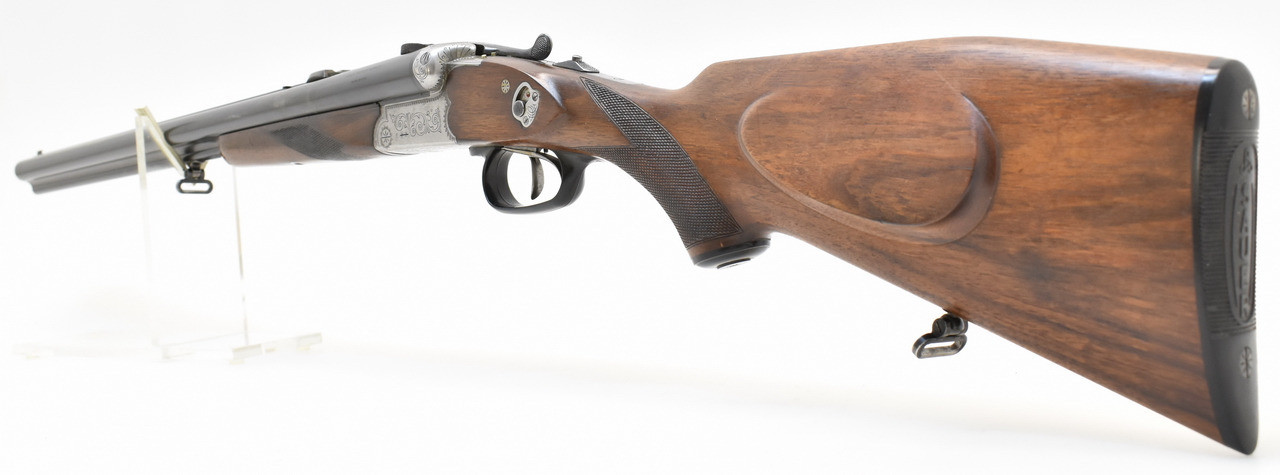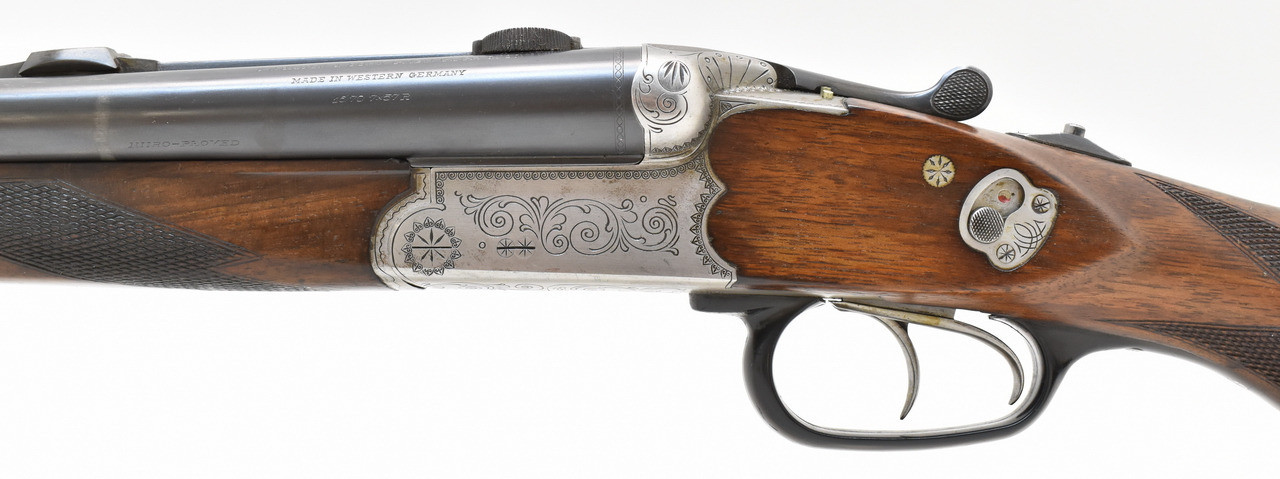 Stahlsystemkasten mit kleiner Arabeskengravur. Abzug mit französischem Rückstecher, der Verschluss ist stramm. Die Brünierung ist stellenweise berieben, Schaftholz mit altersentsprechenden Macken. Blanke Läufe aus Spezial Krupp Laufstahl. Schaftlänge 36cm gemessen vom vorderen Abzug bis Mitte Schaftkappe. Erstbeschuss von 1968.