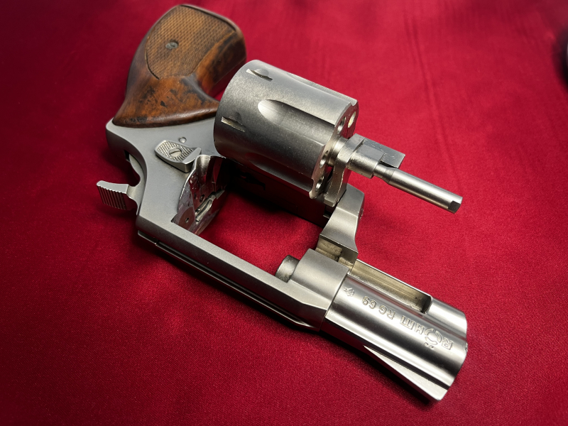 Bei diesem Revolver sind noch sehr viele Bestandteile aus Stahl, wie Abzug, Hahn (Hammer), Trommelachse, gesamte Trommel aus Stahl etc. Der Revolver ist von 1986 und er hat Alters- u. Gebrauchsspuren, von mir selbst jedoch nie geschossen, sondern nur als Vitrinenstück eingesetzt.