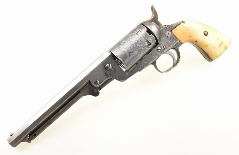 Originaler, 294mm langer und 815g schwerer Schwarzpulver - Revolver mit fünfschüssiger Trommel im " COLT 1851 Navy " Style eines unbekannten Herstellers. 155mm langer, narbiger Achtkantlauf mit unklarer Beschriftung FIRST QUALITY AMERICAN PATTERN. Abzugsbügel linksseitig mit Kaliberangabe. Beingriffschalen. Laufhaltekeil und Rahmenschrauben ergänzt. Überholungsbedürftige Mechanik; Hammer löst nicht aus. Details und Zustand siehe Bilder.