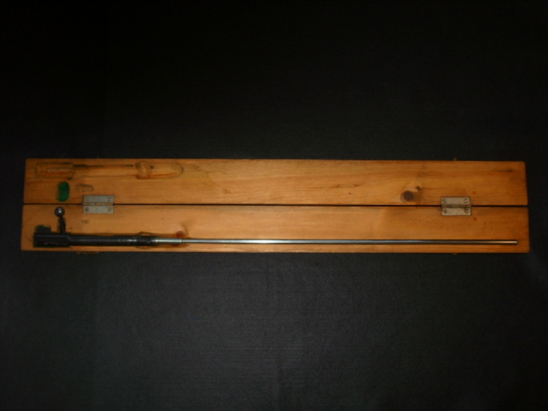 Erma Einstecklauf Mod.24 für K98 k, Einzelader , im Kasten , Kal.22 l.r. Nummergleich, guter blanker Lauf, Beschuss Reichsadler /N , Die Hülse bezeichnet " Fabrikat ERMA Erfurt. Nahezu vollständige Brünierung, minimale Gebrauchsspuren, im Holzkasten, ein Schließhaken vom Holzkasten fehlt, aber ein guter Gesamtzustand